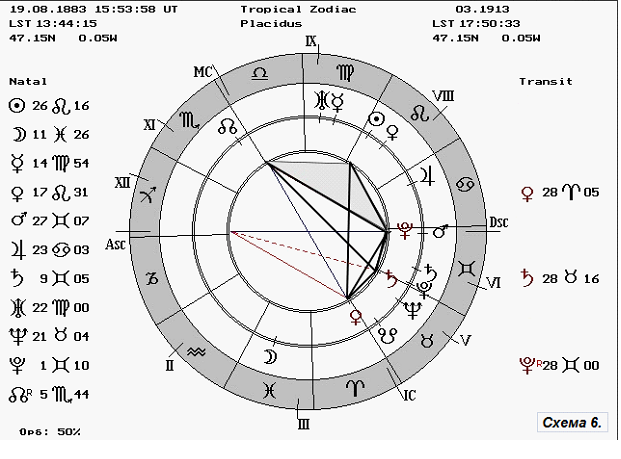 Транзитный Плутон все еще в точном соединении с натальным Марсом и DSC. Транзитный Сатурн поднялся в 5 дом карты Шанель. Мунданный полусекстиль Сатурн-Плутон (последний из трех) 27 февраля 1913 года был в 29-тых градусах Тельца и Блзнецов соответственно. Этот аспект составил точную конфигурацию с углами карты через квиконсы Сатурна к Mc и Asc и трин Плутона к Mc от Dsc (схема 6). До полной мунданной конфигурации аспект между Сатурном и Плутоном дополняет транзитная Венера, которая с марта по июнь 1913 года образовала на IC карты петлю, охватившую область от 27 градусов Овна до 13 градусов Тельца. В этой петле Венера сделала полусекстиль к транзитному Сатурну и секстиль к транзитному Плутону, а также трин к натальному Солнцу, секстиль к натальному Марсу и DSC.