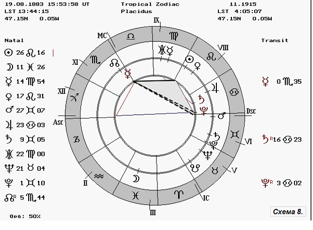 Транзитный Плутон сделал точные аспекты с Марсом на DSC и Солнцем в 8 доме, транзитный Сатурн находится вблизи IC со стороны 4 дома. Точный секстиль между Сатурном и Плутоном, как мы помним, был еще в апреле 1910 года - в 25-тых градусах Овна и Близнецов. С конца августа по конец октября 1910 года через квиконс с Сатурном и квадрат с Плутоном этот аспект дополняет до конфигурации петля транзитного Меркурия в девятом доме натальной карты (схема 4).