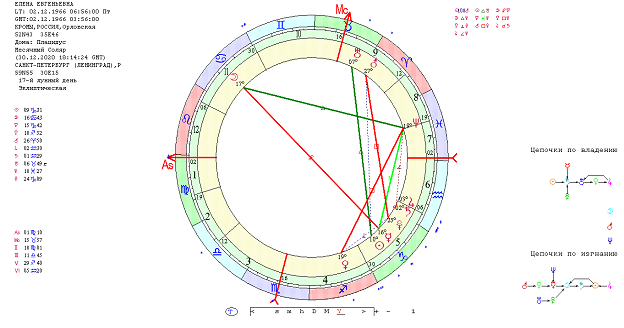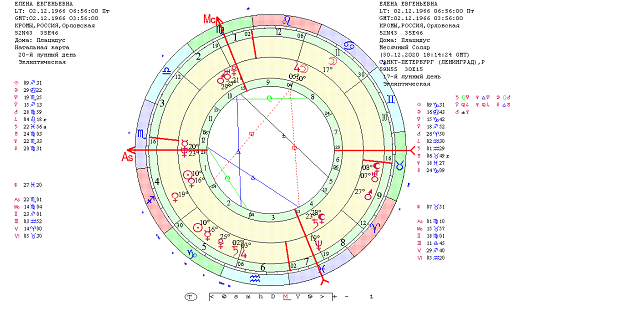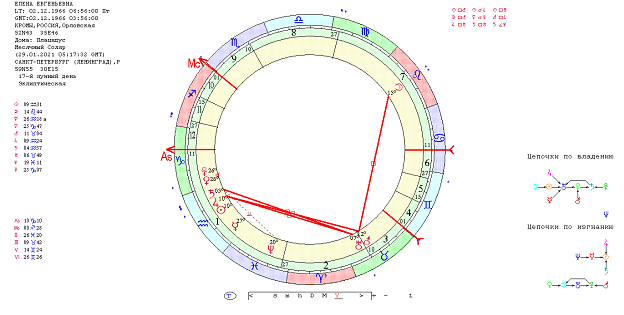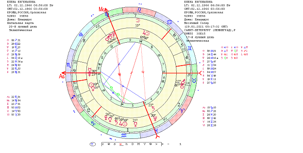 Для исследования буду использовать свою натальную карту, ректифированную в процессе учебы в ВШКА – 02.12.1966, г. Кромы Орловской области, 6 часов 56 минут. Для анализа я взяла индивидуальный год жизни, а именно десять месячных соляров, начиная с января 2021 по ноябрь 2021г.