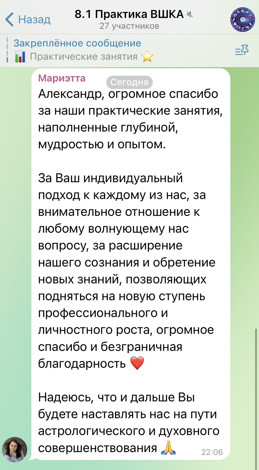 «Выражаем огромную благодарность нашему преподавателю — Александру Айчу! Спасибо, что все эти годы он делился с нами своими бездонными знаниями и разжигал огонь любви к Астрологии. Благодарим его за то, что был рядом и шел навстречу нашим ураническим идеям. Александр открыл для нас безграничную глубину эзотерических знаний и заинтересовал манящим новым миром. Из океана информации наш преподаватель, как проводник, доставал самое интересное, и что важно, преподносил знания с юмором и азартом первооткрывателя. А для новых студентов хочется отметить: обучение у Александра полезно, потому что, кроме знаний, получаешь инструменты их использования — методы и техники анализа разных типов карт, знание подходов к работе с клиентами. По итогам пройденного обучения мы ощущаем себя выпускником ВУЗа, а не школы, так как, хочется отметить высокий уровень информации, в том числе исторический срез и древние интереснейшие методики. С Уважением, Вера Фирулина и выпускники 2023 года обучения группы А. Айча. 15.12.2023»