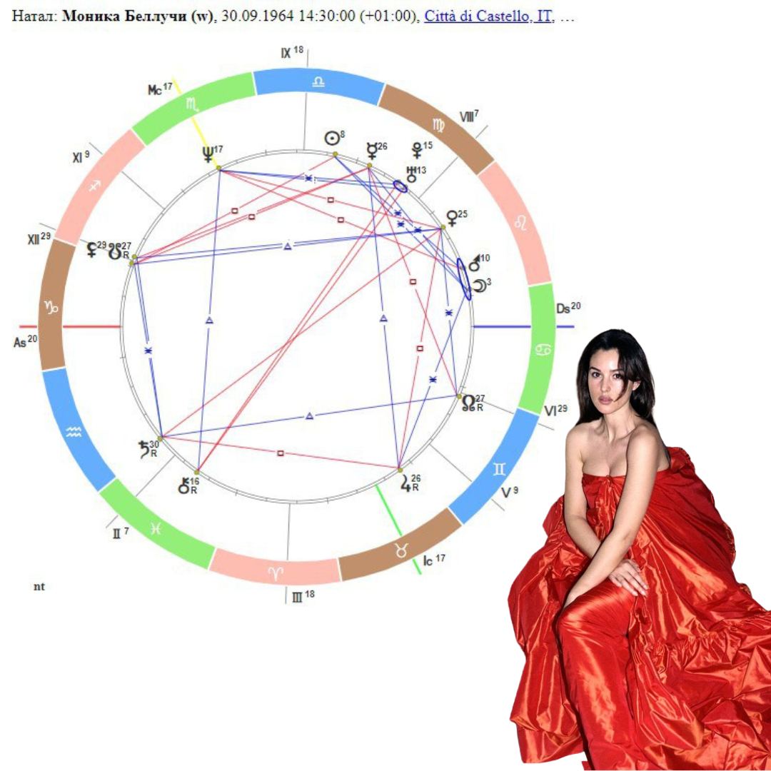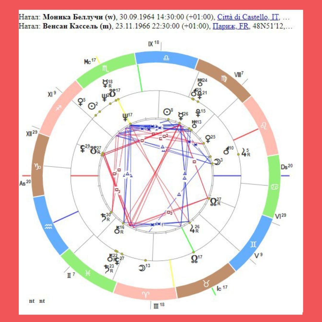 Кроме того, Марс Беллуччи в объятьях планеты больших подарков и возможностей Юпитера Касселя. Планеты в соединении. Соединение управителя 3 дома Моники с управителем 5 дома любви и детей Касселя. Пара действительно много путешествовала с детьми. «Я считаю своим домом Италию, но Венсану важно, чтобы мы проводили достаточно времени во Франции. Иногда нам удается жить как нормальной семье – всем вместе, но все же большинство времени мы остаемся много путешествующими актерами, которые в основном живут отдельно друг от друга: то я на съемках, то Венсан. Но ради детей мы стараемся подстроить свои графики так, чтобы один из нас всегда был с ними. Конечно, идеально было бы работать вместе. Но не все время», – признавалась Моника Беллуччи журналистам.