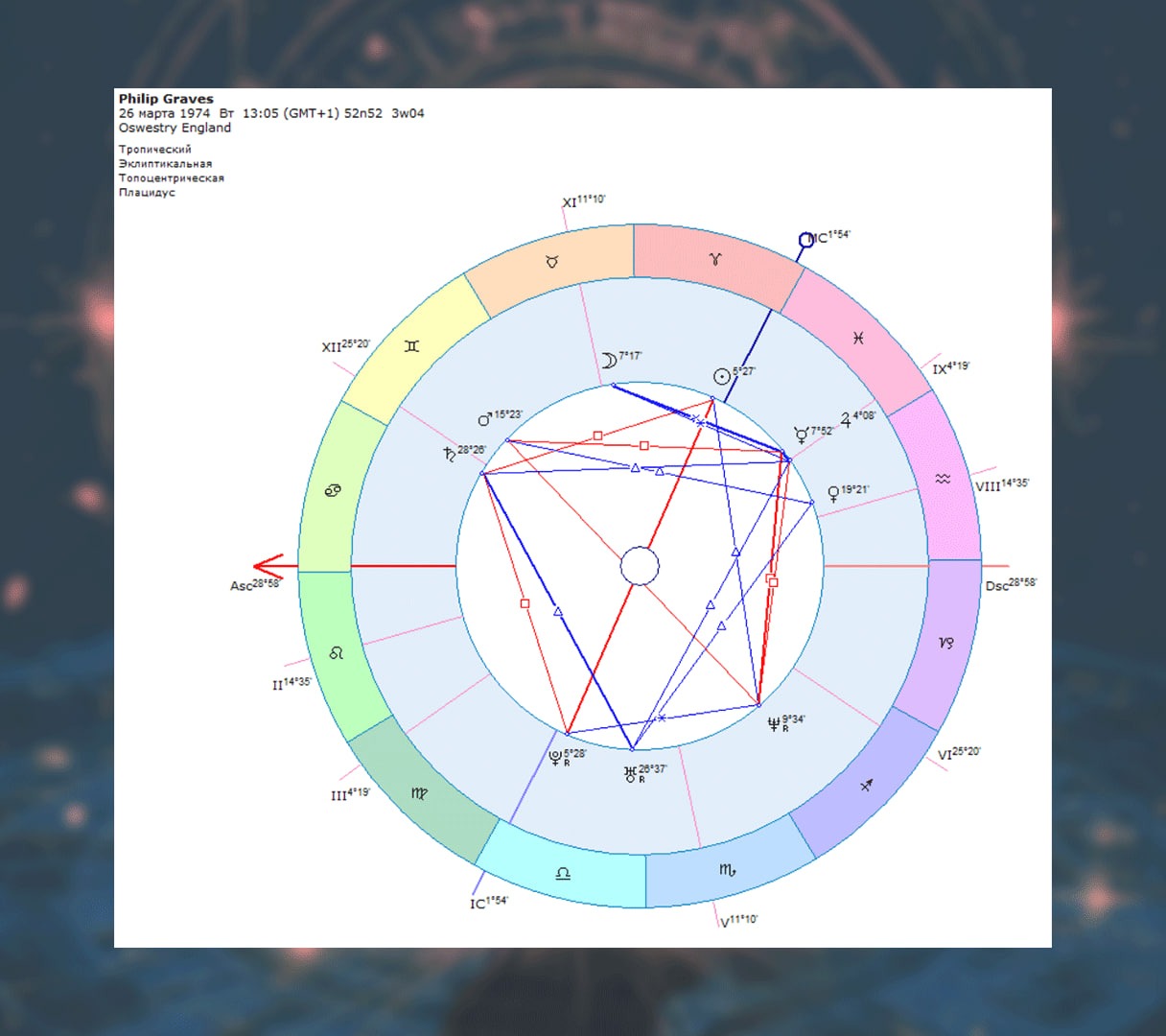 👆Давайте посмотрим на гороскоп автора статьи, историка астрологии Филипа Грейвса
